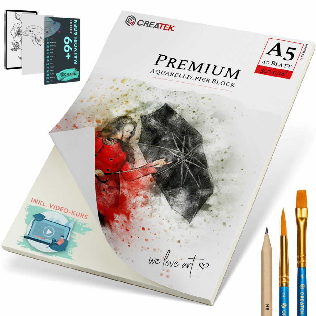 Man bekommt hier 40 Blatt super schönes Aquarellpapier zu einem sehr vernünftigen Preis und obendrein noch einen Pinsel.